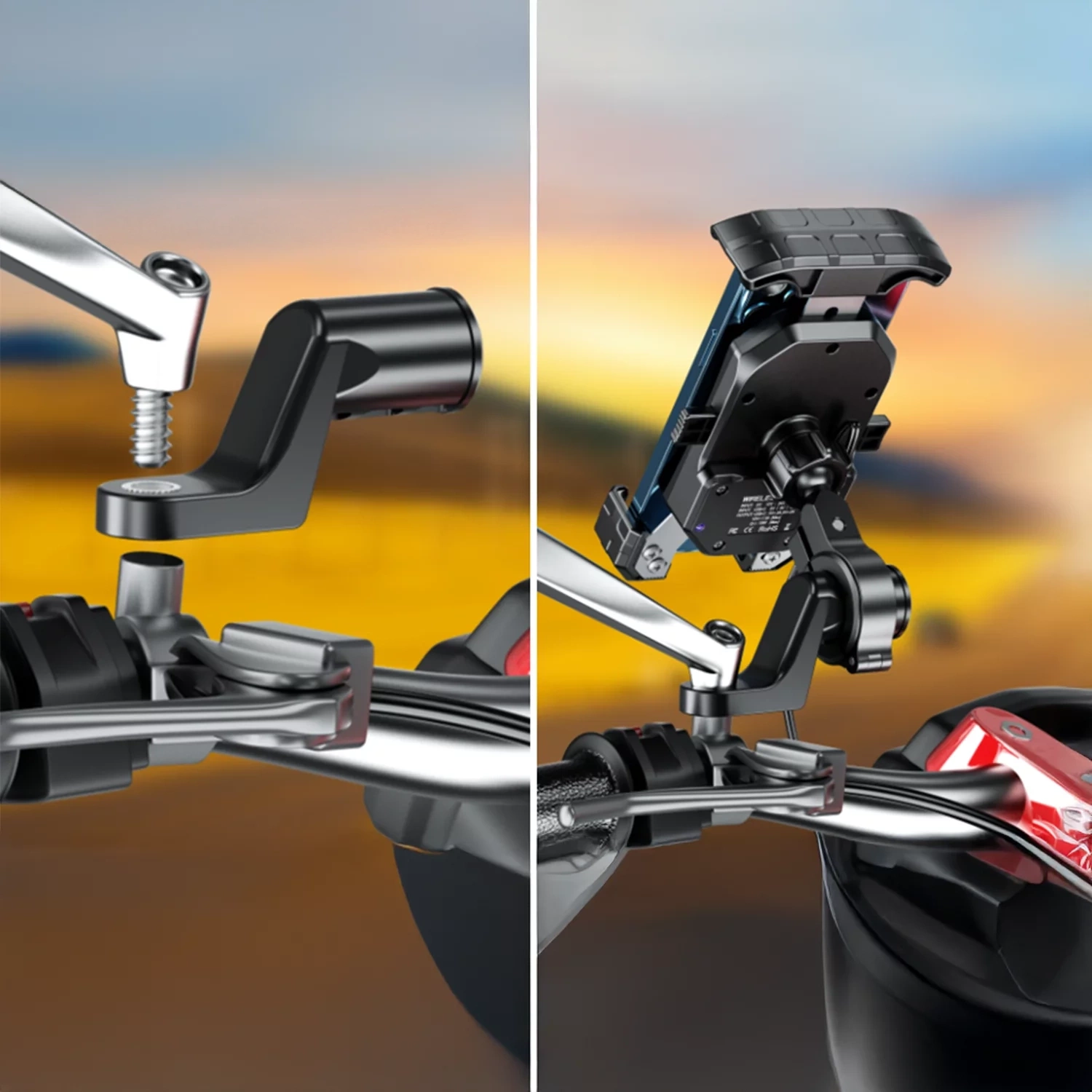 ⭐ Універсальний та зручний – ідеально підходить для кріплення на кермо або дзеркало мотоциклів, скутерів та квадроциклів, поєднуючи функцію тримача для телефону з бездротовою зарядкою.