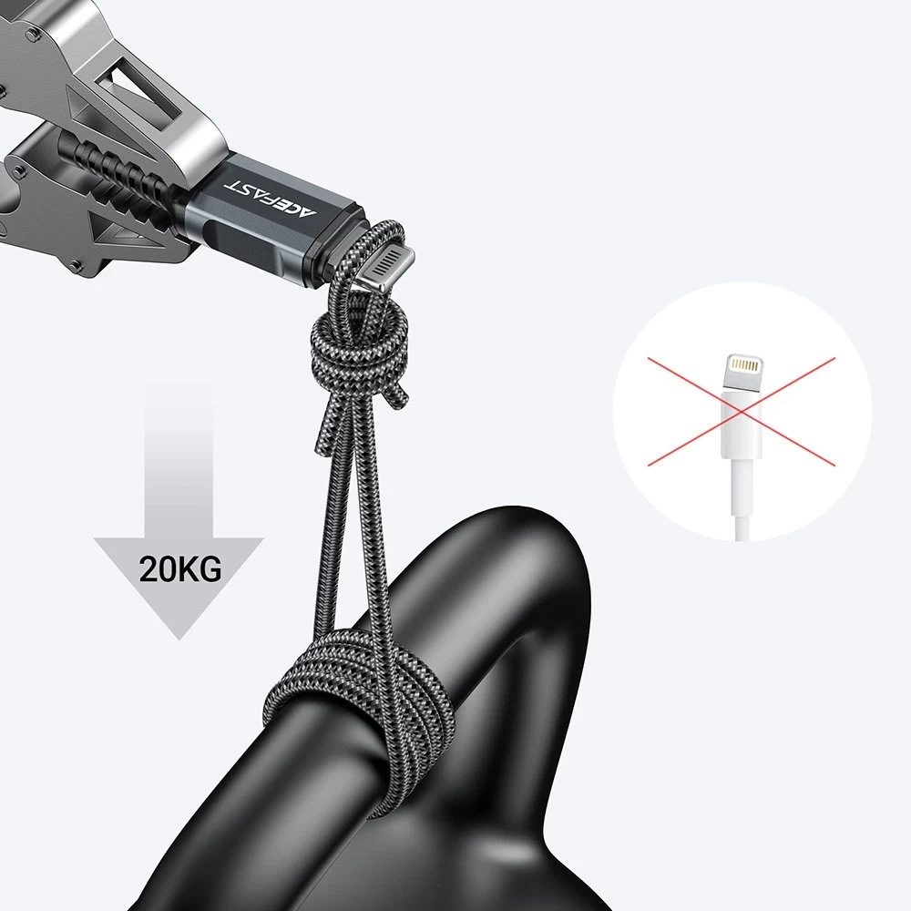 Acefast USB - кабель Lightning для зарядки та передачі даних. Він призначений для пристроїв Apple з роз'ємом Lightning. Він має довжину 120 см і адаптований для роботи зі струмом до 2,4 А. Має сертифікат MFI (Maide For iPhone), завдяки якому телефон не буде виводити повідомлення про неоригінальний аксесуар. Кабель по всій довжині обплетений нейлоном. Вилки мають алюмінієвий корпус. Кінці кабелю захищені від пошкоджень у найбільш частих місцях згинання.