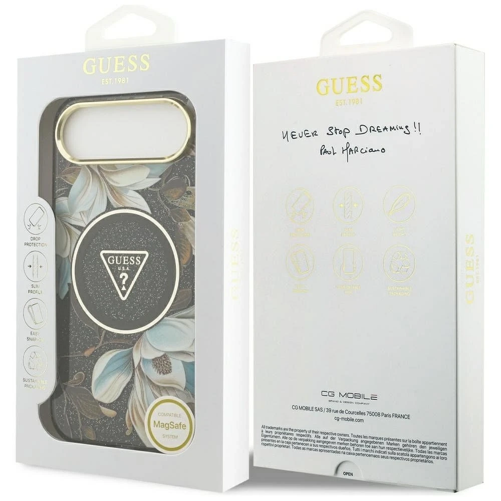 • Etui Guess IML Glitter Flowers Triangle do iPhone 17 Air w czarnym kolorze z kwiatowym motywem i brokatowym wykończeniem. Kompatybilne z MagSafe, chroni przed zarysowaniami i nadaje smartfonowi wyjątkowego charakteru.