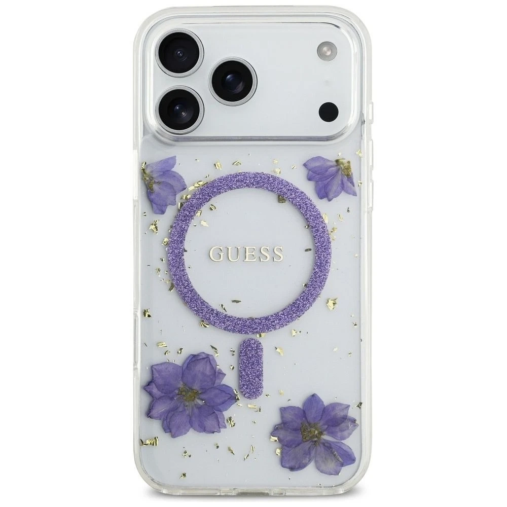 Etui Guess Resin Flowers Glitter MagSafe na iPhone 17 Pro Max to idealne połączenie eleganckiego designu i niezawodnej ochrony. Fioletowe wykończenie oraz dekoracyjne kwiatowe akcenty z brokatem nadają etui niepowtarzalny charakter, jednocześnie zapewniając solidną ochronę telefonu.