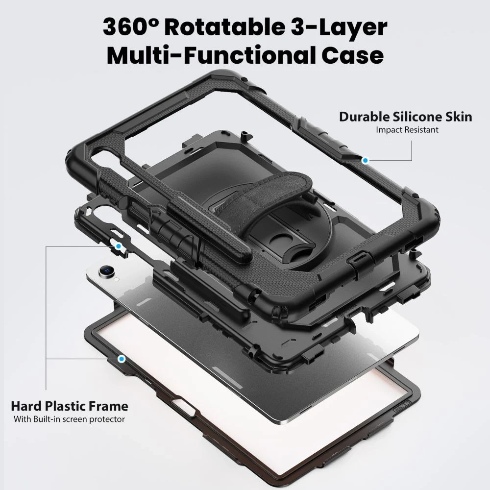 • Tech-Protect Solid do Galaxy Tab S11 11" to pancerne etui 360° z twardym PC, silikonową ramką, wbudowaną szybką i uszczelkami przeciw pyłowi. Wyposażone w podstawkę i pasek, zapewnia najwyższą ochronę w każdych warunkach.