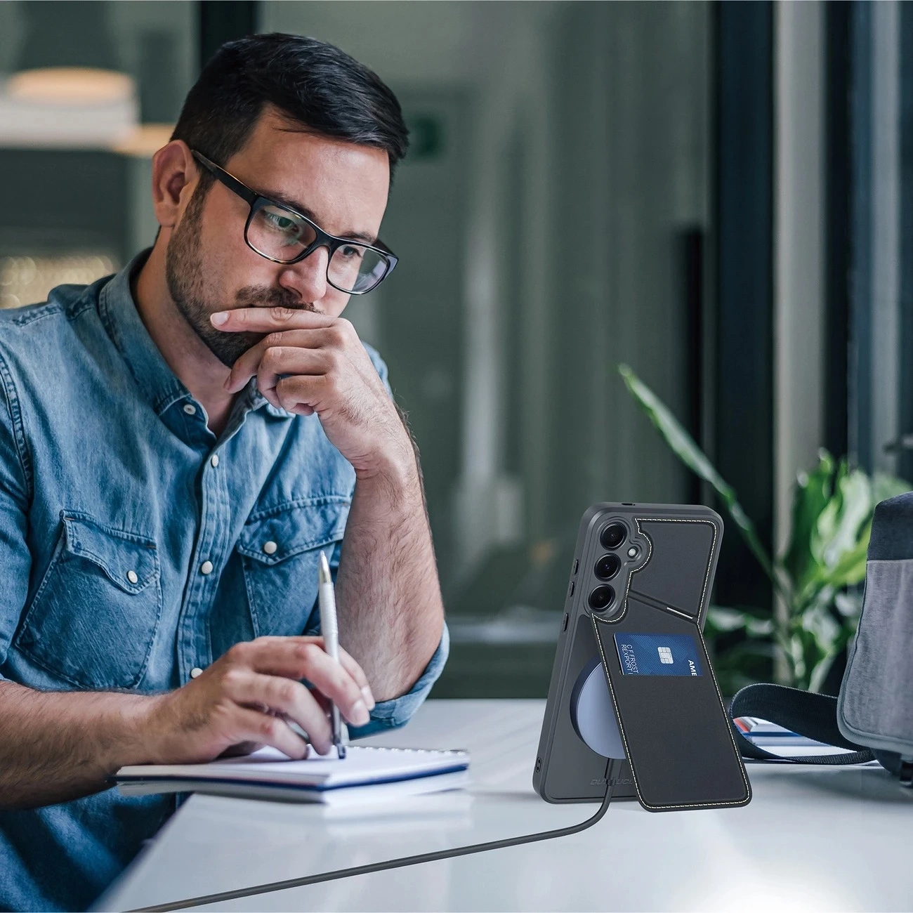 Dzięki wbudowanej podstawce możesz wygodnie oglądać filmy, prowadzić wideorozmowy lub pracować w trybie poziomym, bez konieczności trzymania telefonu w dłoni. Zintegrowane sloty na karty pozwalają przechowywać dokumenty, karty płatnicze czy gotówkę – wszystko w jednym miejscu.